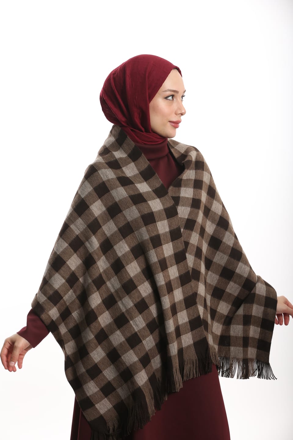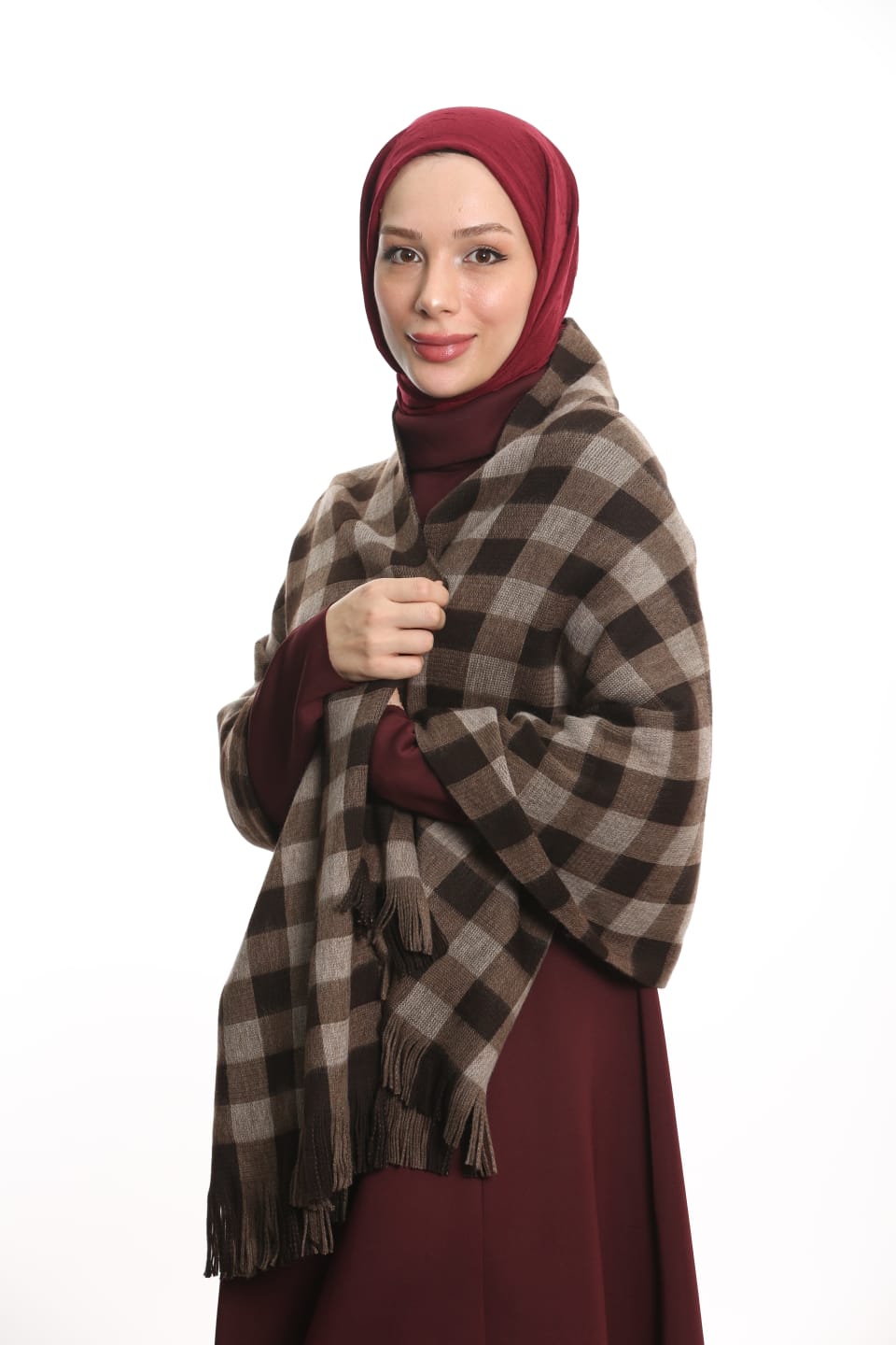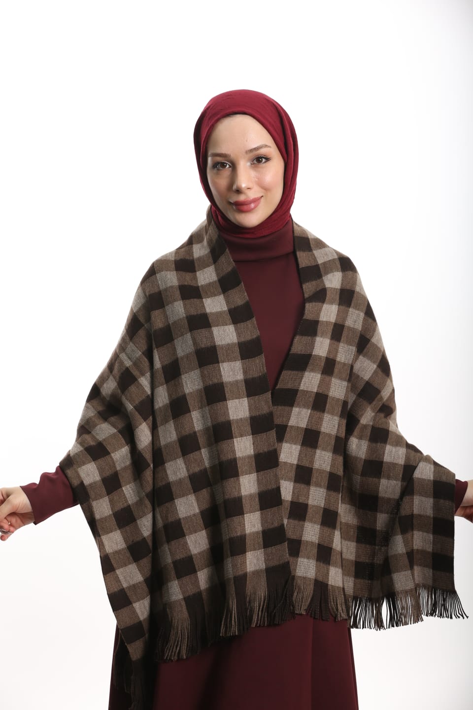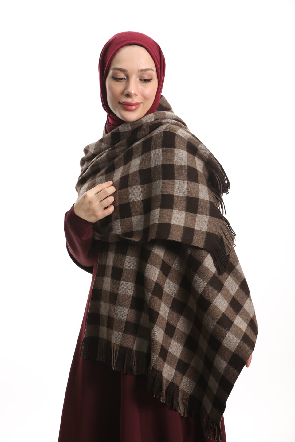 Kahve ve bej tonlarının uyumuyla tasarlanan desenli triko şal, kış aylarında hem şıklık hem de sıcaklık sunar. Yumuşak triko dokusu sayesinde gün boyu rahatlık sağlar, baklava deseni ise modern ve zarif bir görünüm kazandırır.